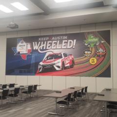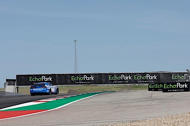 Throughout the Circuit of the Americas track, EchoPark Automotive received signage from the assets: Start Finish Gantry Signage, Front Apron Logo Integration, Pit Wall Facing Signage, Frontstretch Wall Signage, Pit Wall Signage, Turn 1 Gantry Signage, Turn 16 Pedestrian Bridge, Twenty A-Frames/Track Wall Signs, Two Catch Fence Mini Gantry Signs, Ten Light Pole Banners, Two Concourse Signs, Main Entrance Grand Marquee Static Sign, Fairmont Club Scrim, 50% Digital Scoring Pylon Sign, Turn 18-19 Grass, Victory Lane Backdrop, Victory Lane Fencing, Pre-Race Stage, Media Center Backdrop, and COTA Pace Car with sponsored event logo.